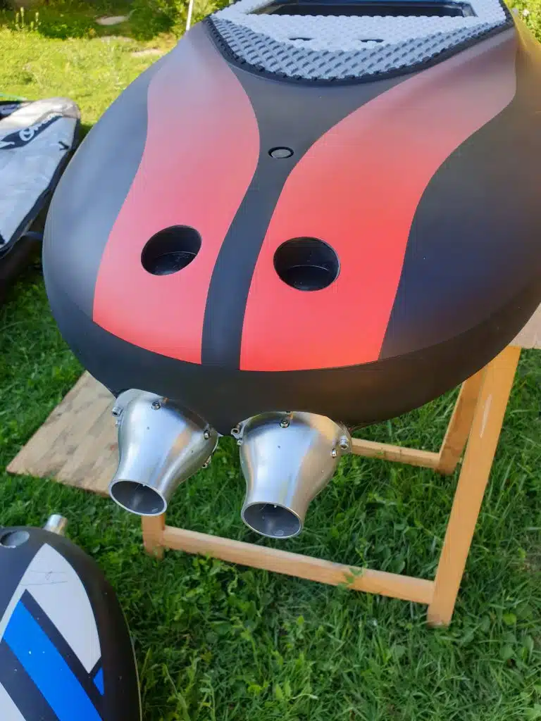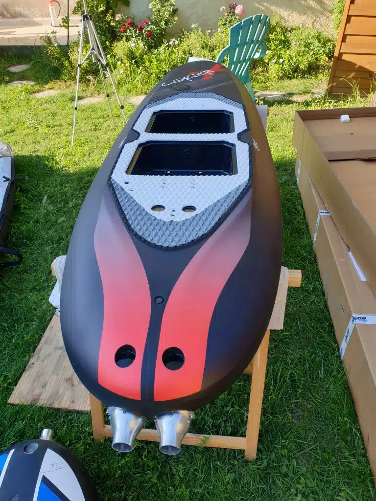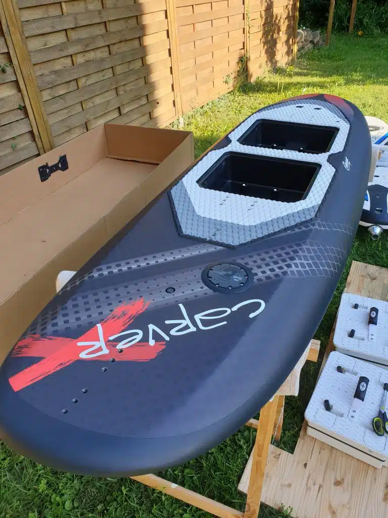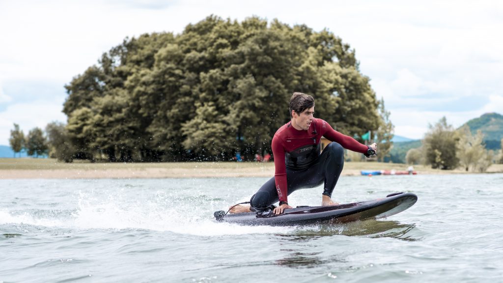 About agility, the Carver X is 240 cm, and about 48 kg with the battery. Which makes the board quite heavy on the ground, but while it is on the water, you don’t feel it anymore. Speed and acceleration are very good. Due to the length, turns are a bit longer compared to a short board such as an Ewave or an Awake. But you can carve easily and make shorter turns having a very nice feeling of carving. The board is very easy for beginners, but also very playful for advanced riders. Which is a very good compromise for a board that you may share with friends of family.