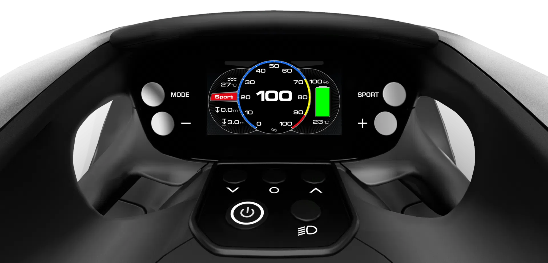 L’écran TFT haute définition intégré affiche en temps réel les données clés : vitesse, profondeur, niveau de batterie et temps de fonctionnement restant. Les poignées, ergonomiques et précises, garantissent une prise en main intuitive, même lors de manœuvres rapides.